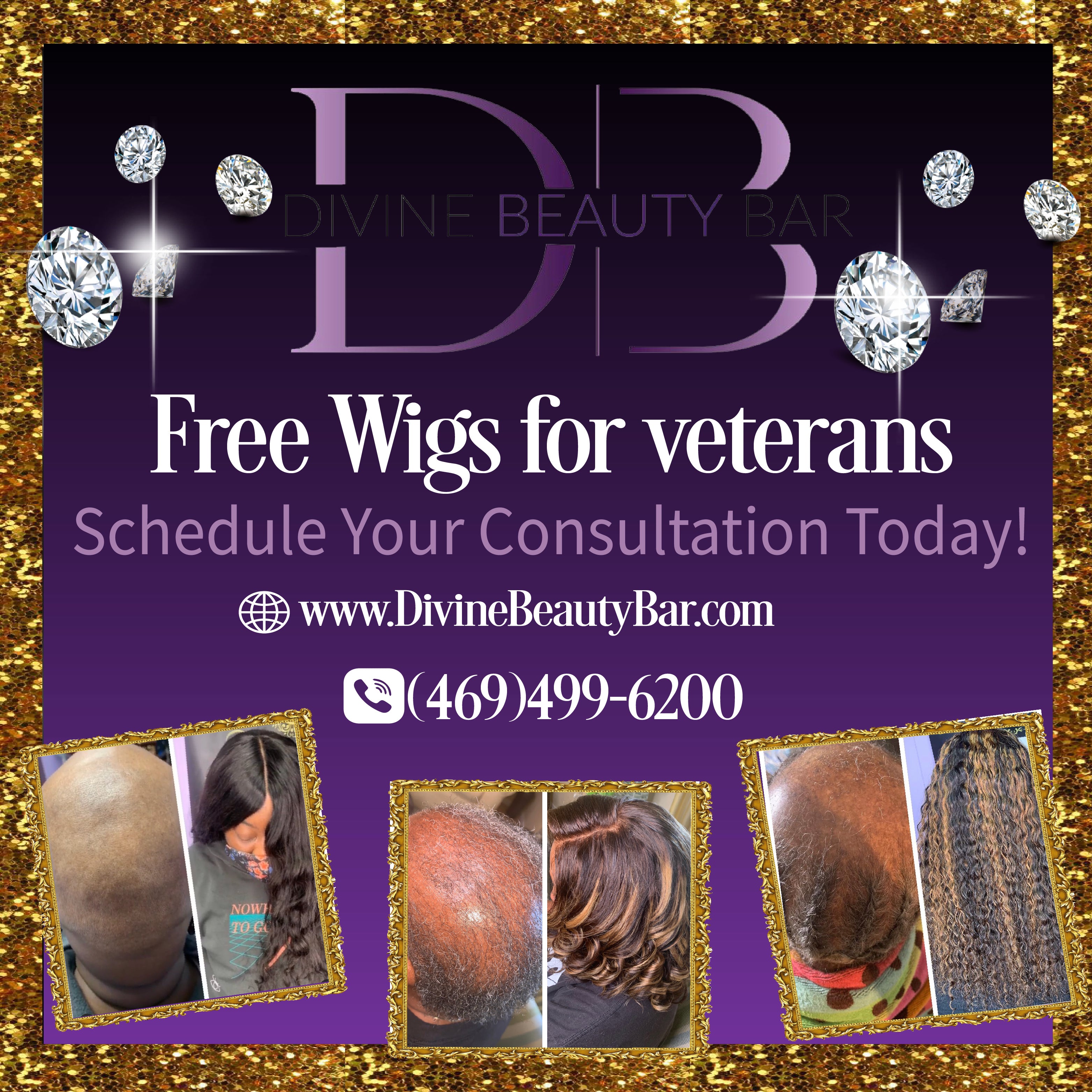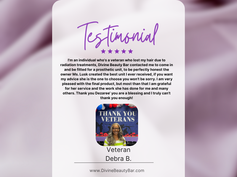Divine Beauty Bar: Home of the Wigs for Veterans at No Cost is a Certified Service-Disabled Veteran-owned Small Business! A Hair prostheses or Cranial prostheses is considered Durable Medical Equipment (DME). It is a custom-made wig specifically designed for people with hair loss (Alopecia) due to Age, Stress, Burns, a medical condition or treatment such as Chemotherapy and Radiation, Trichotillomania and more. Divine Beauty Bar accepts most major medical insurances, Veteran (VA) Benefits, HSA/FSA and Care Credit!